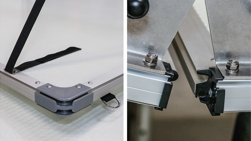 Die Kunststoffecken dienen nicht nur dem Schutz der Ecken der Bodenpaneele, sie ergänzen auch die Aluminium-Bodenprofile. Sie ermöglichen das materialschonende Einführen der Zelthautkeder in die Kederleisten der Kantenprofile. Außerdem ermöglichen sie das kontrollierte Ums-Eck-Führen dieser Keder.